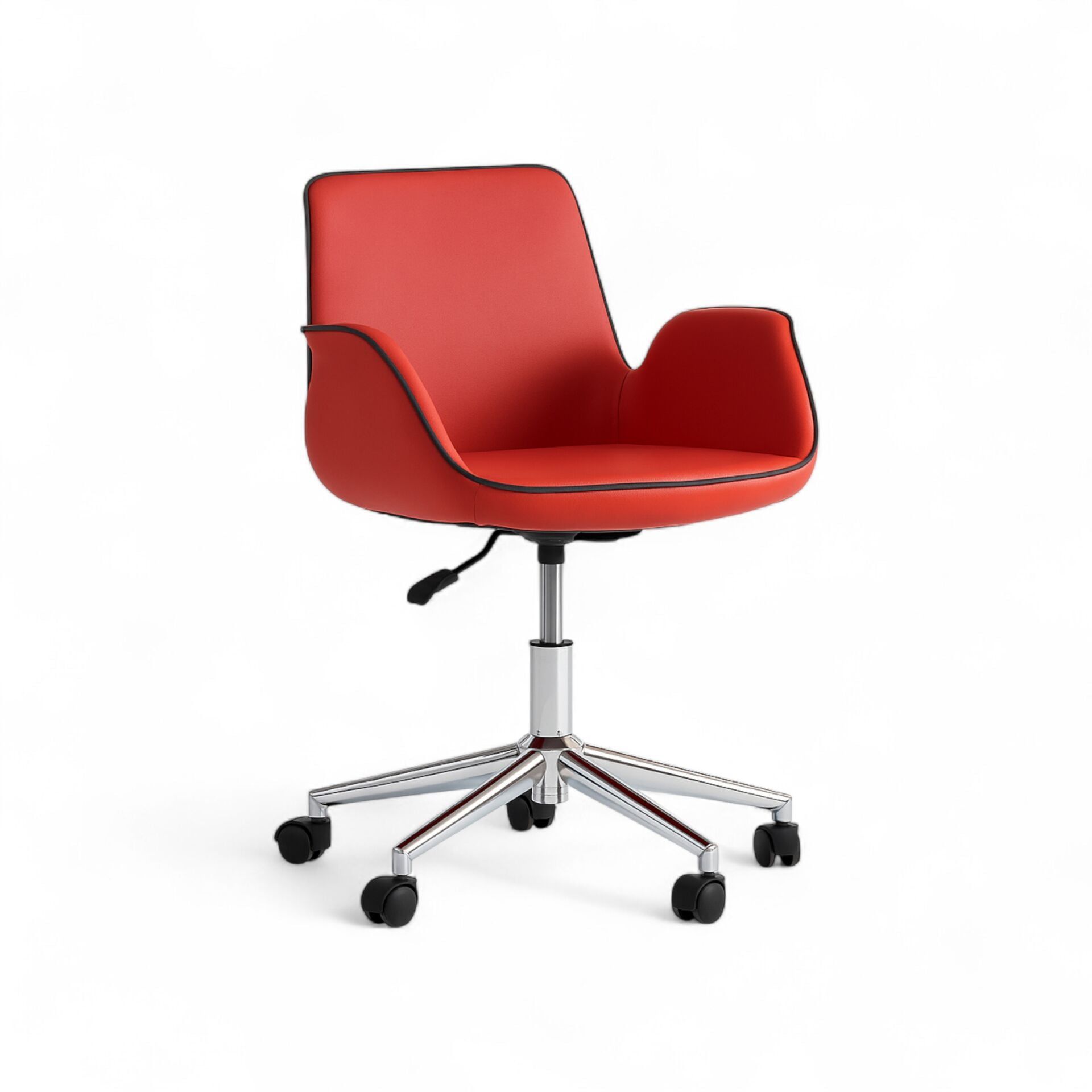 F-303 Çalışma Koltuğu, cesur ve dinamik tasarımıyla çalışma alanlarına modern bir kimlik kazandırır. Canlı kırmızı deri döşemesinin kenarlarını çevreleyen siyah biye (fitil) detayı, koltuğun akıcı ve heykelsi formunu çarpıcı bir şekilde vurgular. Bu grafiksel çizgi, tasarıma özgün ve unutulmaz bir karakter katar.