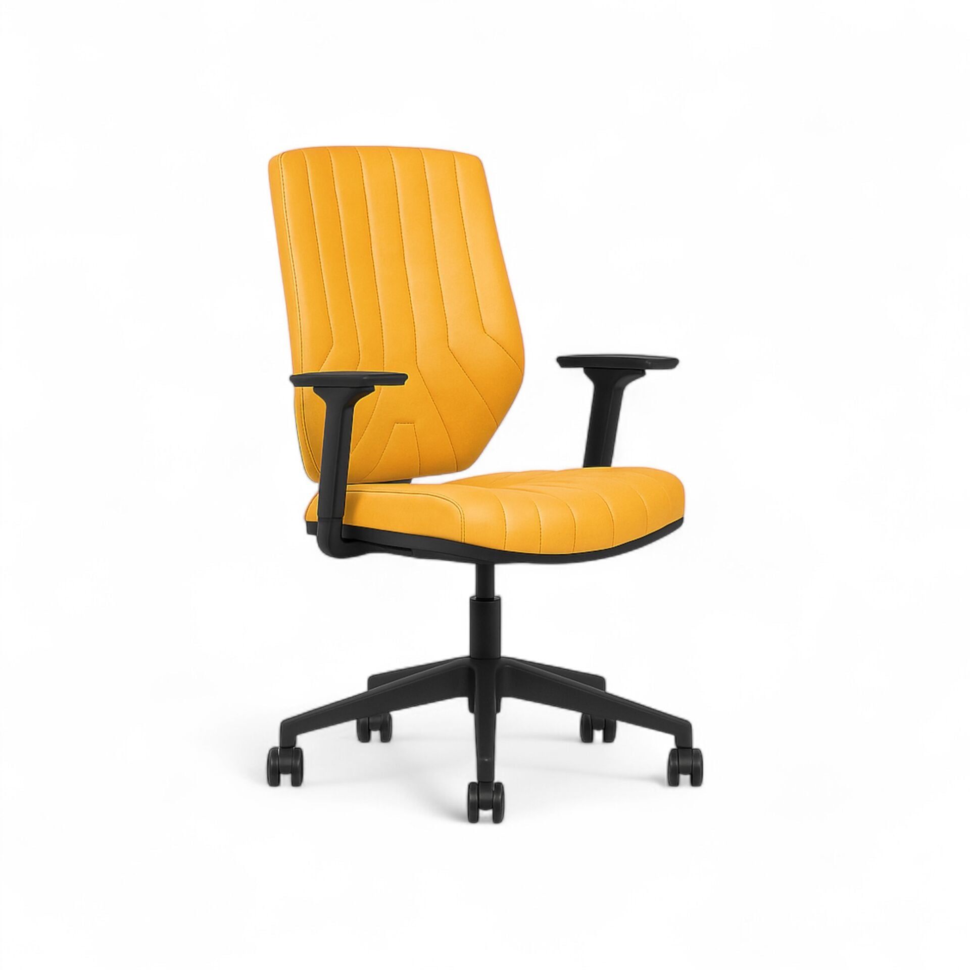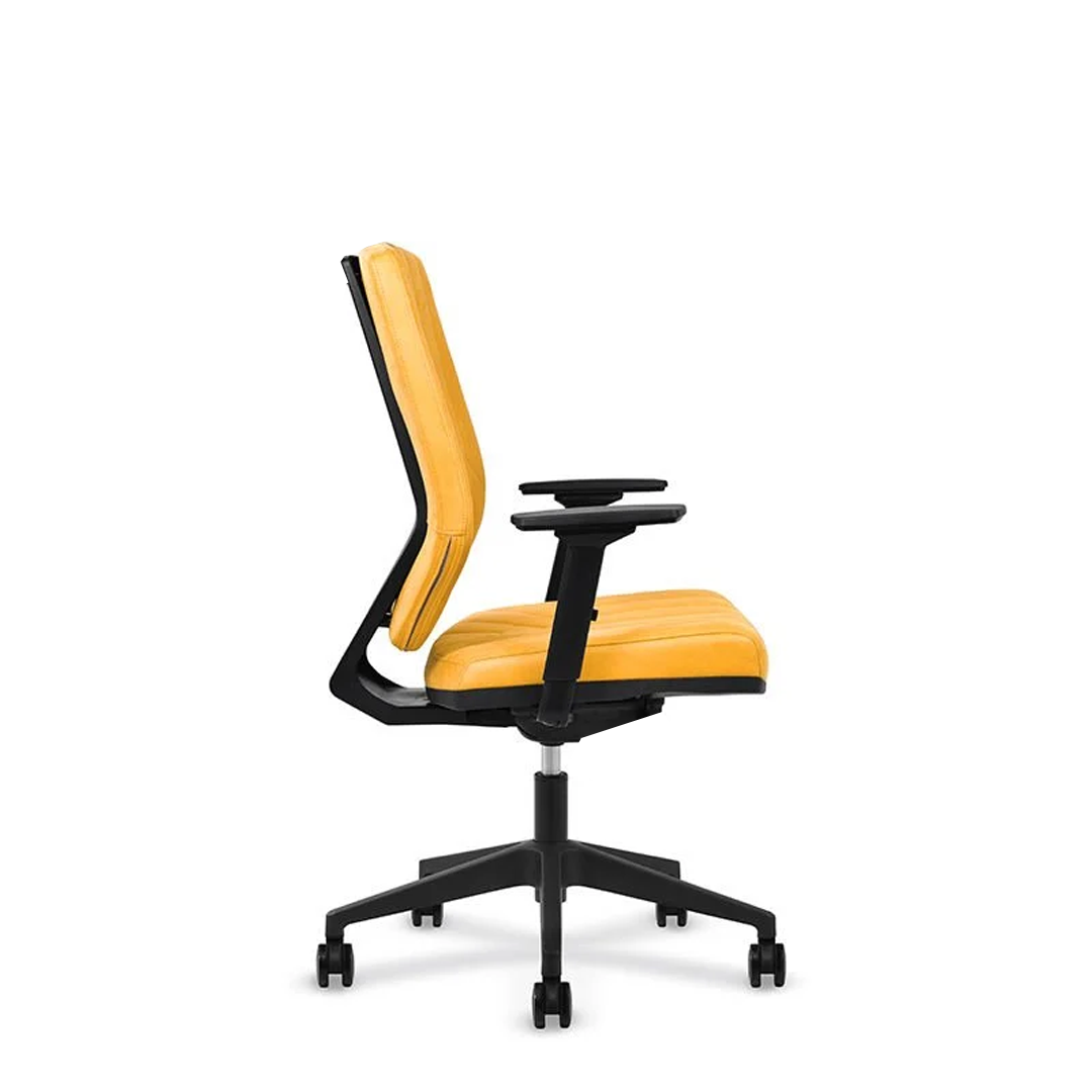 Fusion Çalışma Koltuğu, modern ve mimari bir estetiği, yüksek fonksiyonellikle birleştiren, tasarım odaklı bir modeldir. Canlı sarı deri döşemesi, çalışma alanınıza anında enerji ve yaratıcılık katarken, dikey kanal dikişleri tasarıma zengin bir doku ve ritim kazandırır.
