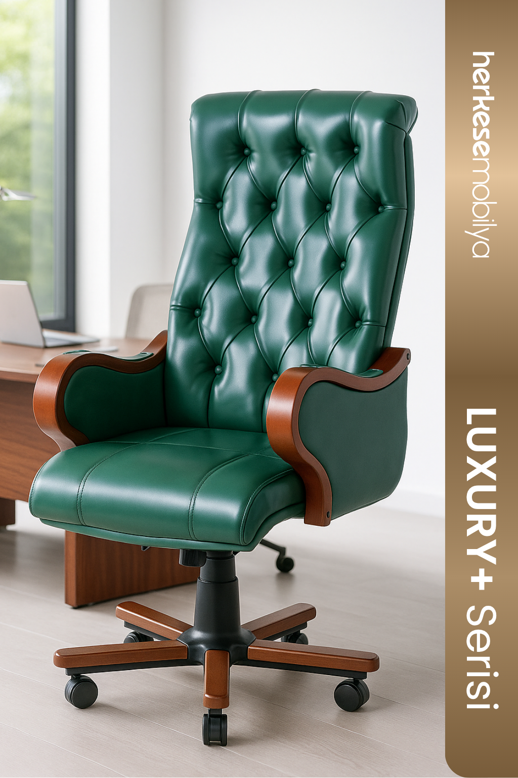 Noir Chester Yönetici Koltuğu, klasik tasarımın ve zanaatkarlığın en görkemli halini ofisinize taşıyan, heybetli bir makam koltuğudur. Sırt kısmındaki derin ve el işçiliği gerektiren Chesterfield kapitone detayları, koltuğa zamana meydan okuyan, aristokrat bir karakter kazandırır. Asil yeşil deri döşemesi, özenle şekillendirilmiş masif ahşap kolçaklar ve ayaklarla birleşerek ofisinizde güçlü bir otorite ve prestij sembolü haline gelir.