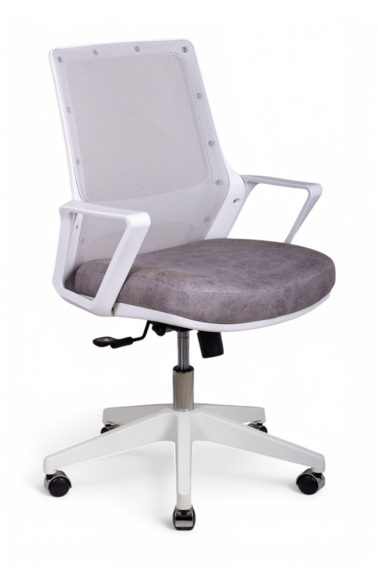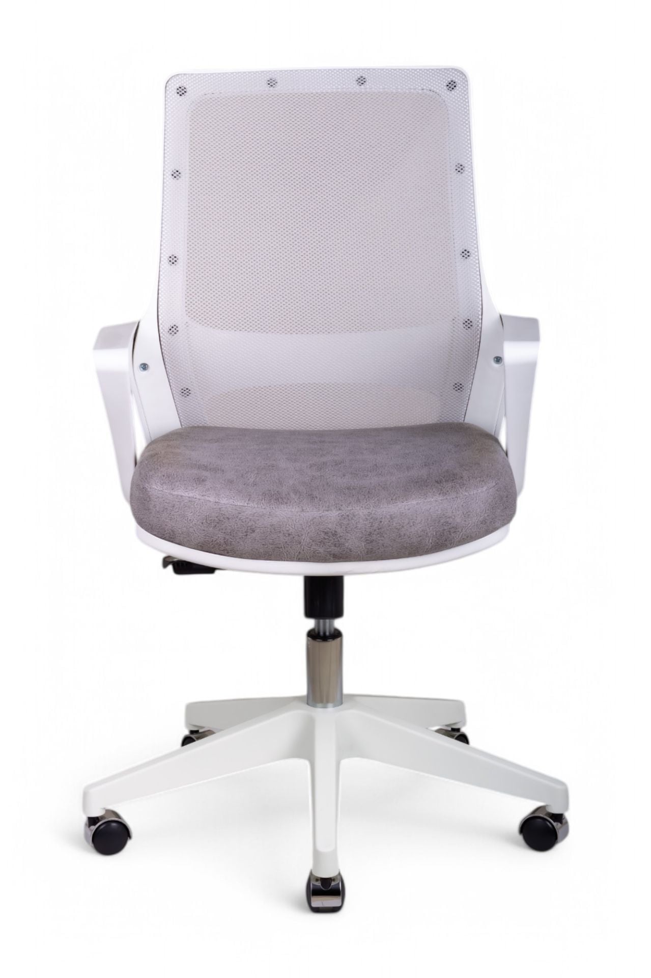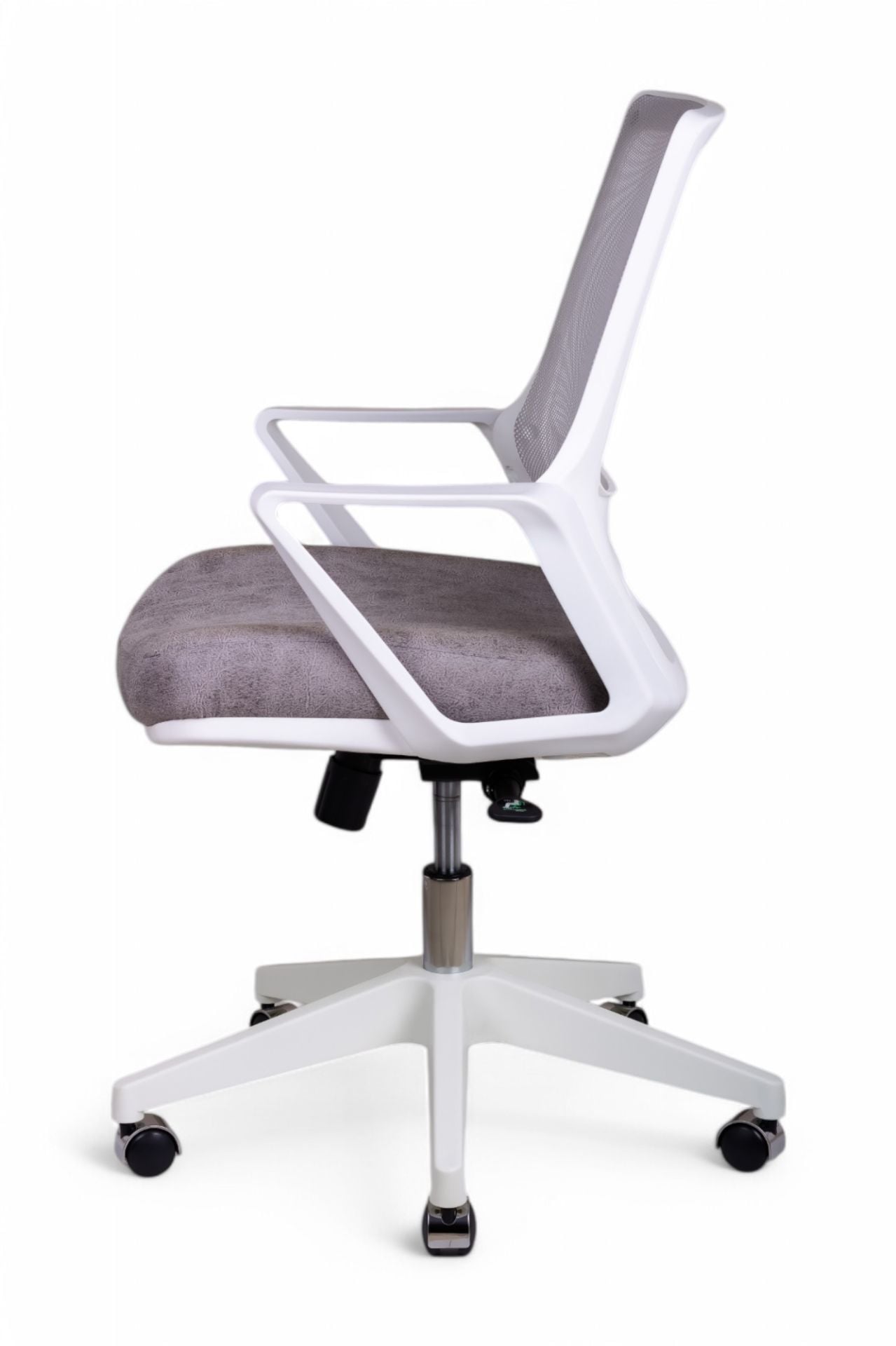 Pluton Çalışma Koltuğu, modern ve aydınlık çalışma alanları yaratmak için tasarlanmış, şık ve fonksiyonel bir modeldir. Beyaz gövdesi ve file sırtı, mekana ferah ve temiz bir görünüm katarken, özel dokulu gri kumaş oturağı ile sofistike bir kontrast oluşturur. Ev-ofisler, gençler için çalışma alanları veya minimalist ofis dekorasyonları için ideal bir seçimdir.