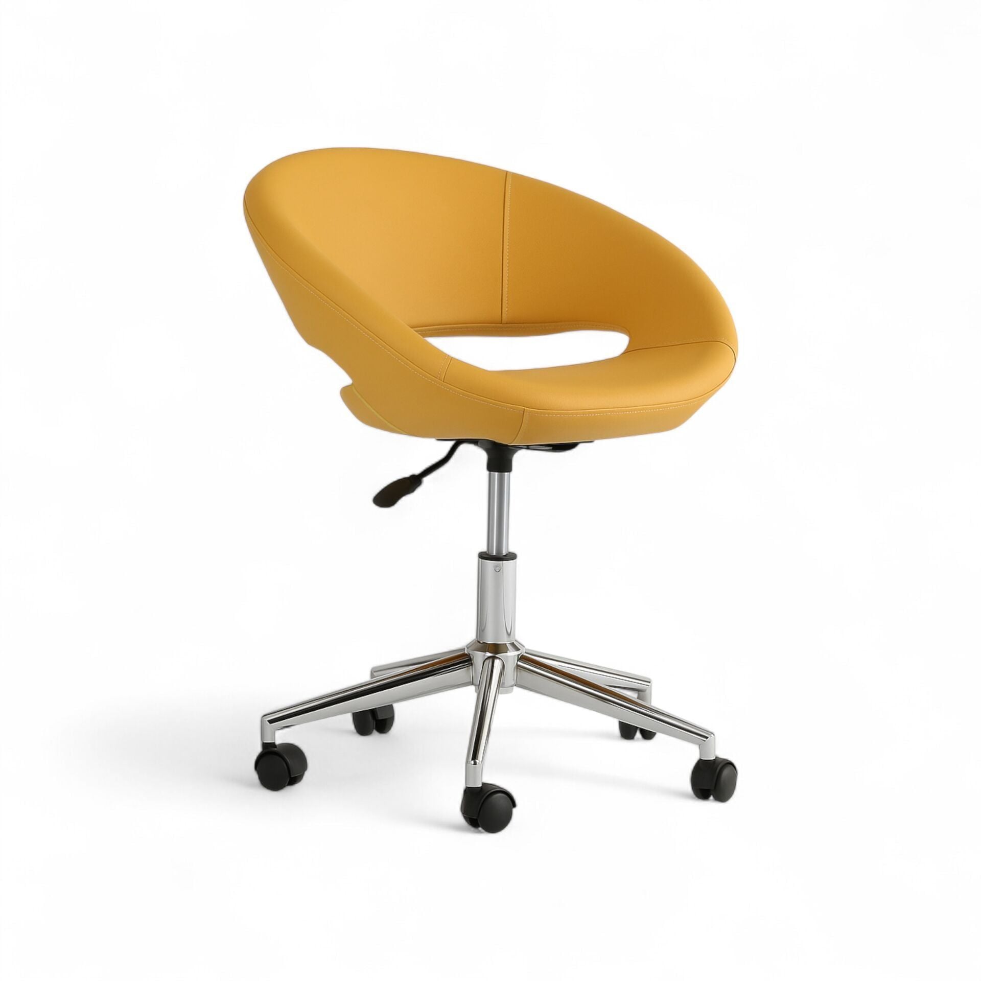 Total Çalışma Koltuğu, cesur ve avangart tasarımıyla geleneksel ofis koltuğu formlarına meydan okuyor. Neredeyse tam bir daire şeklindeki gövdesi ve ortasındaki estetik boşluk, ona heykelsi ve unutulmaz bir karakter kazandırır. Canlı sarı deri döşemesi, bu özgün tasarımı daha da vurgulayarak yaratıcı ve modern mekanlar için mükemmel bir odak noktası oluşturur.